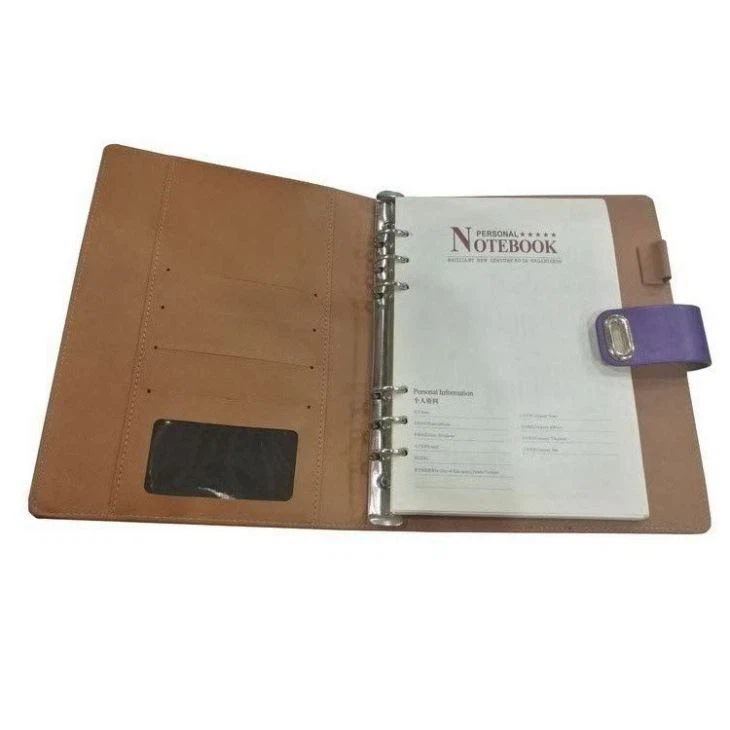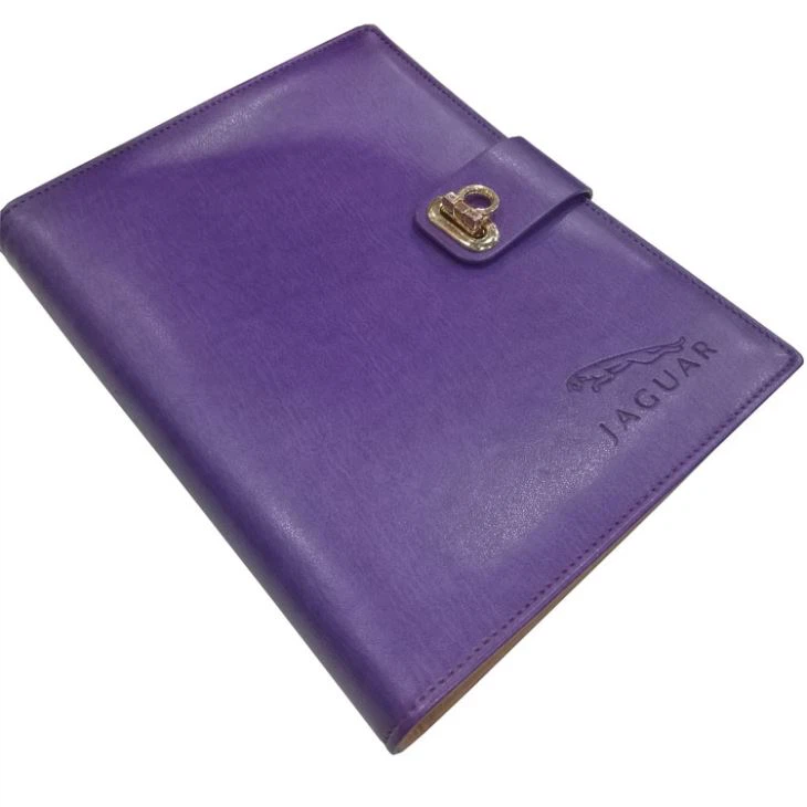 Purple Puleather+ Sponge+ Ekiraamo kya PVC ekya kitaka ku lwa .Omutegesi w'enteekateeka y'omuntu ku bubwe .Cover, custom logo embossed ku nsonda ya ddyo, okutunga Onedge, bbaatuuni ya zaabu plating ring to closure,